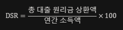 먼저 DSR(Debt Service Ratio)은 대출자의 총 대출 원리금 상환액이 연간 소득액에서 차지하는 비율을 나타냅니다. 이를 통해 대출자의 상환 능력을 평가합니다.