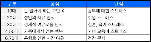 모든 사람은 나이대별 거의 비슷한 장/단점을 겪게 된다. 피할 수 없는 문제이기도 하고, 상황에 따라서 준비만 철저히 된다면 미래에 겪을 리스크를 최소화하고 행복한 오늘을 살아갈 수도 있다.